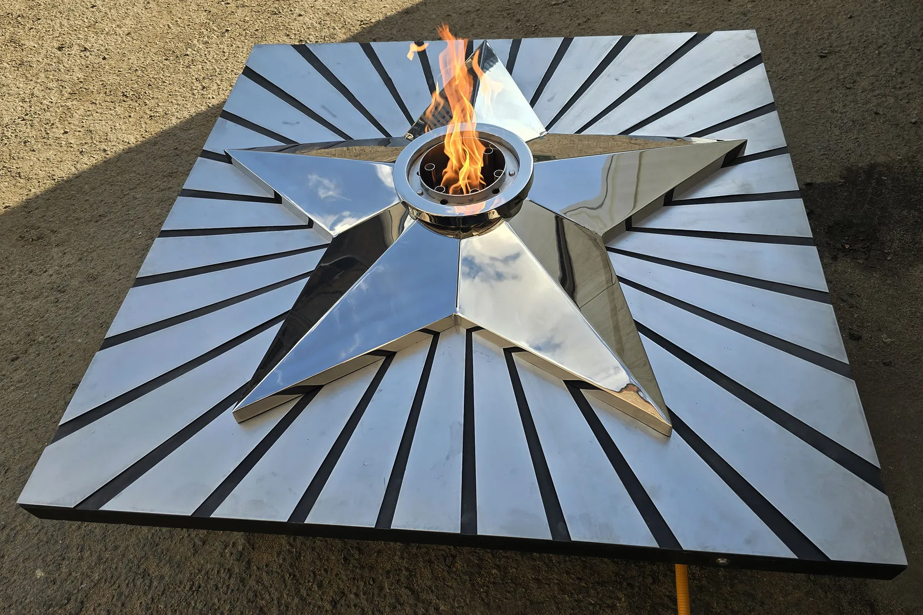 Мобильная группа оборудования «Вечный огонь» - это действующая модель настоящего вечного огня. Компактные размеры и небольшой вес позволяют использовать изделие в формате выездного мероприятия. Высота пьедестала 350 миллиметров, габариты пьедестала по верхнему срезу 1200 хь1200 мм. Модель оснащена устройством искрового розжига пламени, работает розжиг по нажатию пусковой кнопки на передней панели изделия. Топливо – сжиженный газ (пропан), гибкая линия подвода газа позволяет вынести баллон с газом на расстояние до 50 метров от места расположения самого мобильного модуля. Оборудование сертифицировано, безопасно и функционально. Для работы модуля используется газовая ветроустойчивая горелка модели ГВД 379 10 89 00 ПС. Изделие производится и поставляется в продажу группой компаний NSO-PiroClub