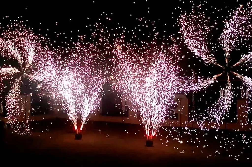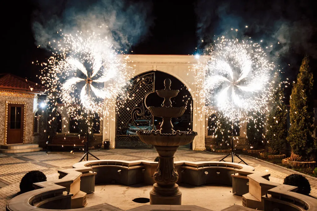 Профессиональные огненные вертушки из сценических фонтанов монтируются на любой выделенной вам площадке для наземного фейерверк шоу. С помощью фонтанов, такие изделия создают множество искр в динамике кругового вращения пиротехнического элемента – конструкции